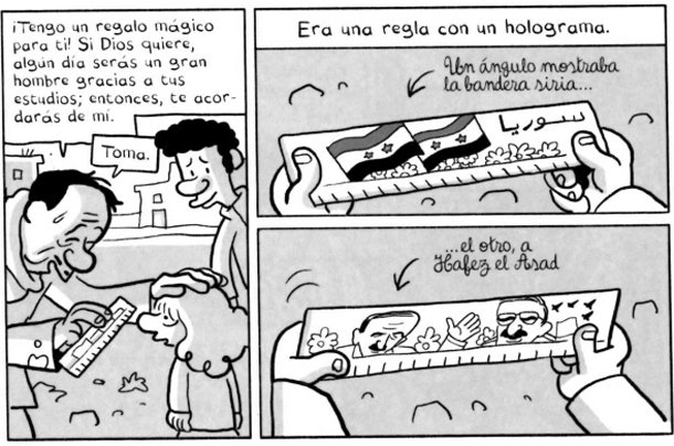 La segunda entrega de ‘El árabe del futuro’ comienza en el capítulo V. Estamos en 1984, Riad ha cumplido seis años y se enfrenta a su primer día de colegio. La Libia de Gadafi, donde transcurría buena parte de la primera parte, ya pertenece al recuerdo. Su padre ha regresado a Ter Maaleh, el pequeño pueblo cercano a Homs donde nació. Está decidido a iniciar una meteórica carrera en la administración de Hafez el Asad, el dictador sirio que domina el país con mano de hierro e imagen omnipresente: desde inmensos carteles a la regla con holograma que Riad lleva a su primer día de colegio. Como para (casi) todos los niños, el descubrimiento del colegio, la pérdida de la libertad, es un golpe inolvidable. Literalmente. Porque la maestra del pequeño – una combinación hoy imposible en la Siria rural de mujer con hiyab, ropa ajustada, zapatos de tacón y minifalda – ‘instruye’ a sus alumnos a golpe de vara.
