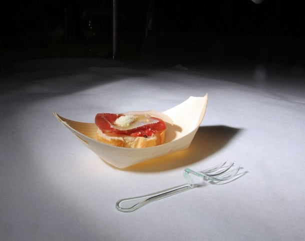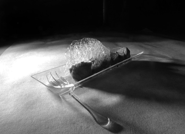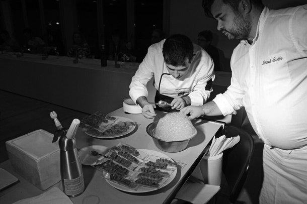 Por ejemplo, probamos un tataki de bonito con espuma de soja y wasabi con el que aprendimos cómo es la química de la lecitina. La lecitina se utiliza como emulsionante y su función es estabilizar la espuma, que está formada por dos fases, una líquida y una gaseosa. En este caso la líquida es la salsa de soja y wasabi y la gaseosa está formada por burbujas de aire. La estabilización se consigue modificando la tensión superficial de este sistema aire-liquido a través de la lecitina, que actúa como un tensioactivo.