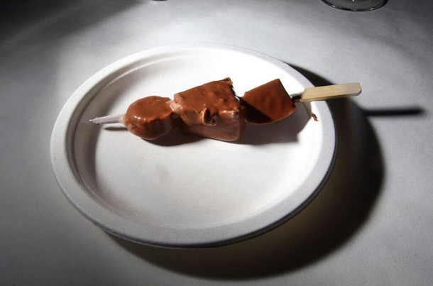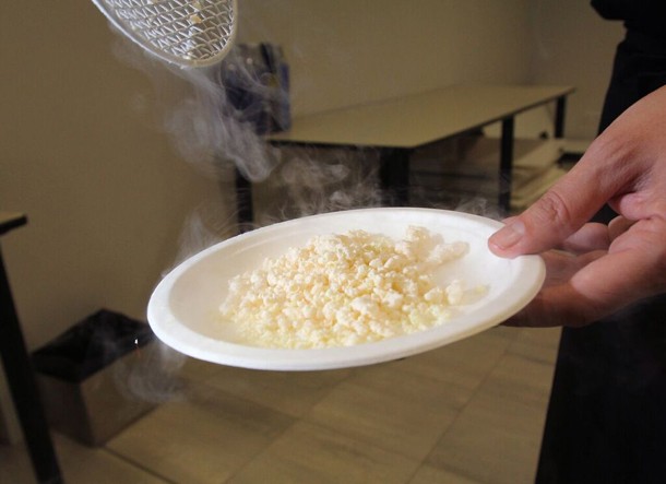 Sin duda, lo más original de la sesión fueron las palomitas de aceite de oliva y agua de tomate. El nitrógeno líquido fue el responsable. El nitrógeno es un gas inerte, inodoro e incoloro que pasa a estado líquido a -196 ºC. Mediante la utilización del nitrógeno líquido los alimentos también se cocinan, pero esta vez mediante el frío, conservando así todo su sabor, aroma y color. Dado que la mayoría de los alimentos tienen una gran cantidad de agua, al contacto con el nitrógeno líquido se produce una congelación casi inmediata de la misma. De esta manera, los alimentos cocinados con nitrógeno líquido quedan sólidos por fuera, pero cremosos o incluso líquidos por dentro. Utilizando un sifón y un baño de nitrógeno líquido, Pedro Antolín nos preparó unas palomitas deliciosas, crujientes por fuera que al deshacerse en la boca liberaban la intensidad del aceite de oliva y el tomate. Una delicia de la que pudimos disfrutar gracias a la química.