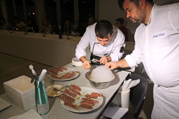 En el taller de cocina molecular que se celebró en la Universidad de La Rioja, dentro del programa de la Semana de la Ciencia, el cocinero Pedro Antolín y su equipo prepararon unas tapas exquisitas y originales gracias a técnicas como la esferificación, la gelificación y la utilización de nitrógeno líquido. Creo que todos degustamos esos pequeños platos de otra manera después de que Rodrigo Martínez nos explicara qué procesos físico-químicos había detrás de ellos.