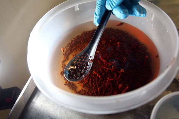 Las famosas esferas que tanto utilizan los grandes chefs también estaban presentes en este plato en forma de caviar de chocolate. Los procesos de esferificación de los alimentos se realizan con alginato de calcio. Este compuesto también es un polisacárido en el que, dada la posición de sus átomos de carbono y oxígeno, éstos interaccionan con el calcio, provocando una estructura molecular denominada por su similitud de “caja de huevos”, en la que la caja estaría formada por el alginato y el calcio estaría colocado en la posición de los huevos. Esta estructura tiene cierta rigidez, creando una interfase líquido-gel, que debido a la tensión superficial forma esferas. Lo mejor de todo fue poder hacer nuestras propias esferas de yogur líquido en el laboratorio. Tan fácil como introducir unas gotas de yogur líquido en una disolución de alginato de calcio, esperar unos minutos hasta que se forme la esfera y limpiar los restos de la disolución con un poco de agua.