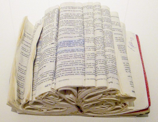 Los recovecos de la sala te llevan hasta la octava sección, el ‘libro como herida’. Un idea que se sustenta en que toda herida se corresponde con una lesión, en un traumatismo y en el convencimiento de que no solo existen heridas físicas, también las hay psicológicas. “Las heridas pueden producirse en la cubierta de un libro, en las notas a pie de página. Hay que recordar que los libros han sido considerados, en algún periodo y en la mayoría de culturas, elementos peligrosos por sus contenidos, ya que han ayudado al hombre a ser libre, a pensar sin ataduras”. Como ejemplo: ‘Wound’, de Anish Kapoor y ‘Cartac’i, de Joan Brossa y Perejaume.