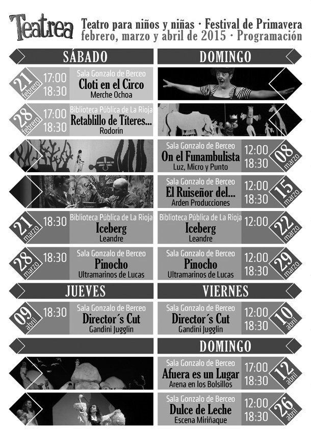 En total, esta edición de Teatrea incluiye nueve obras de teatro dirigidas a niños de entre 2 y 9 años, y tendrá como escenarios la Sala Gonzalo de Berceo y la Biblioteca de La Rioja, durante los fines de semana de febrero (a partir del sábado 21), marzo y abril.