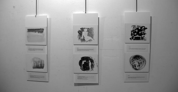 Inicialmente, la exposición estaba estructurada como un cuadrado de 9x9 formado por las 81 tablillas ilustradas, correspondientes a los 81 capítulos de la novela de Gao Xinjian. “Y a esa distribución regresarán –explica- cuando se trasladen a la galería Glera, pero al exponer en la Biblioteca, un espacio de invitación a la lectura, pensé que debía seguir el orden de los capítulos”.