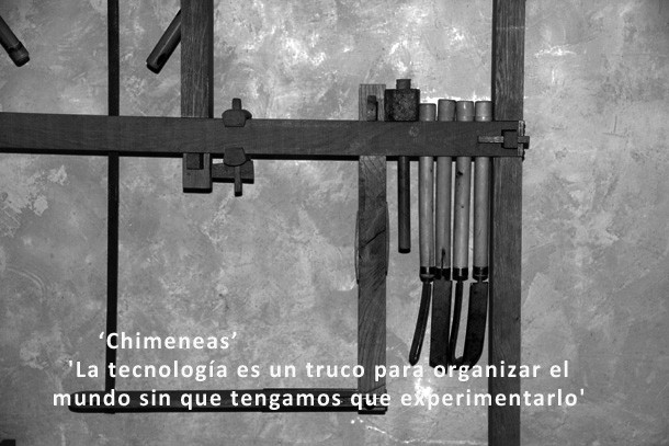‘Chimeneas’ acoge piezas que representan edificios cálidos y habitables. “La tecnología –dice De Flores citando a Max Frixch- es un truco para organizar el mundo de manera que no tengamos que experimentarlo. Hoy la tierra se ha convertido aparentemente en una ilusión, un espejismo configura el mundo como un todo al que tenemos acceso y comprendemos a través de la tecnología”. El arquitecto madrileño apunta a la reflexión de Josep Plá en su Cuaderno Gris, cuando pone en boca del protagonista de ‘La Calle Estrecha’: “Ya estoy cansado de comprobar que detrás de las grandes cosas no hay absolutamente nada, que casi inconscientemente me acostumbro a valorar con un criterio contrario a sus dimensiones externas”. De Flores asegura compartir sin reticencias el análisis del escritor catalán.