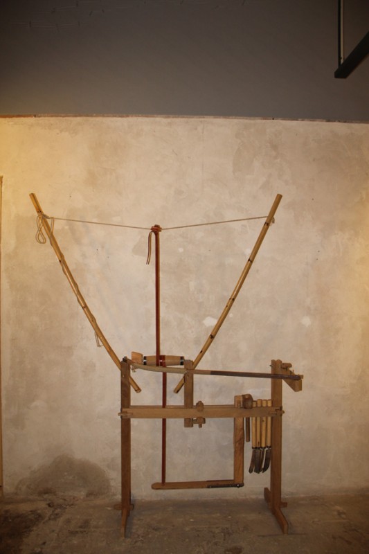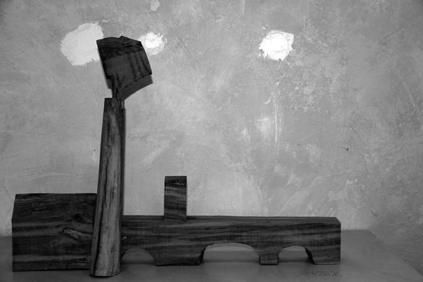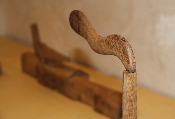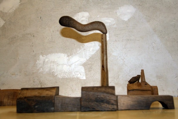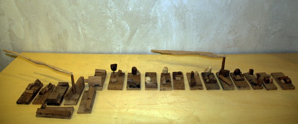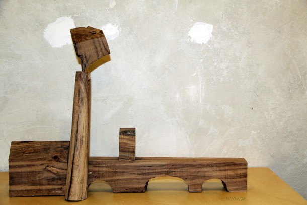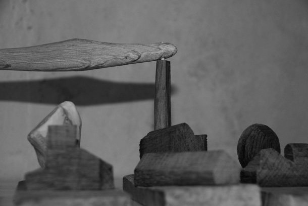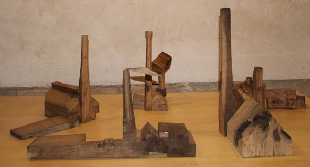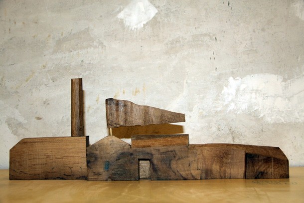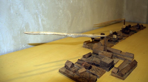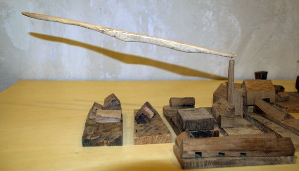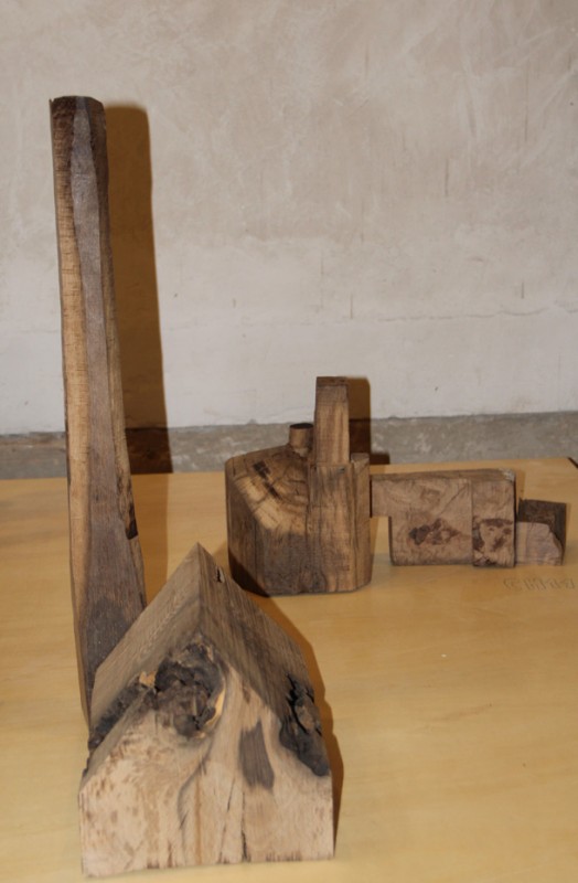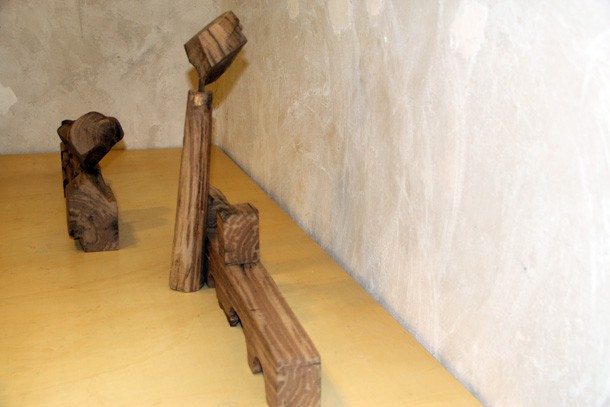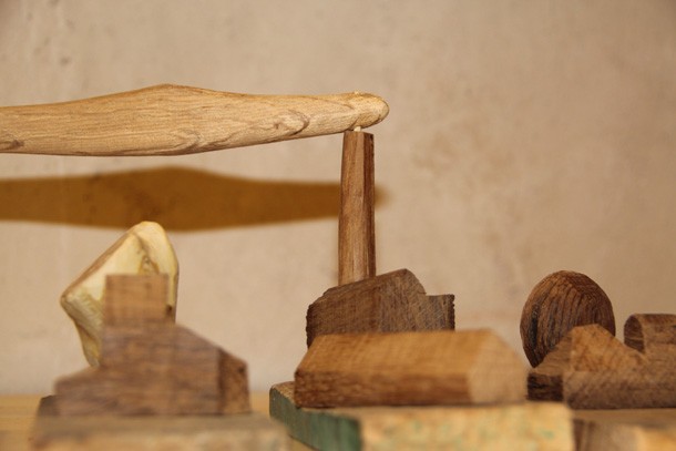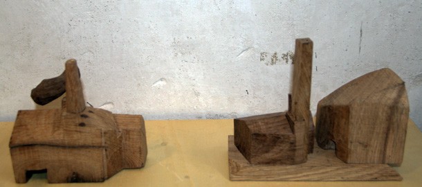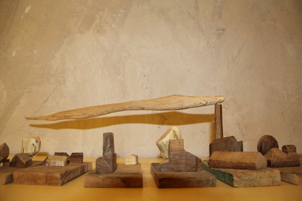 Carlos de Flores es el Gulliver lanza la invitación a mimetizarse con su arquitectura que seduce a quien la observa. La explicación sobre la fascinación que provocan esas casas a reducida escala quizá haya que buscarla en la forma de concebirlas y crearlas. “Un método próximo a lo artesanal –explica el catálogo-, tanto en la búsqueda y la utilización de la materia prima, como la forma de trabajar la madera”. De Flores rastres en busca de vigas de madera con varios siglos de edad que hayan cumplido una función constructiva y posteriormente hayan sido desechadas como material de derribo. Un vez en su taller recurre a las herramientas tradicionales para moldear el roble –siempre roble-… serruchos, garlopas, limas, escofinas, cepillos…