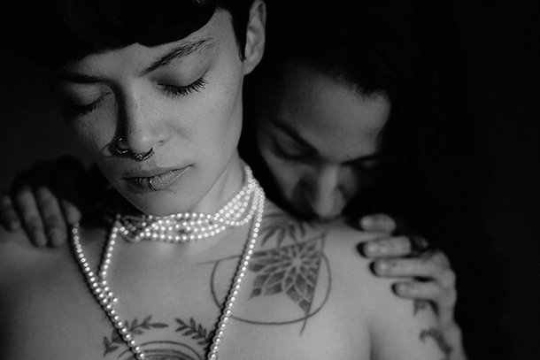 "Dos cuerpos que se reconocen en la cercanía, en la respiración compartida. Las perlas recorren la piel y marcan el ritmo de una entrega consciente. Hay manos que guían, bocas que se detienen en un instante eterno. Es un juego de control desde la delicadeza. Este no es un encuentro para mirar rápido: es una atmósfera donde introducirse. Una línea invisible de erotismo entre dos mujeres, imposible de ignorar". Mariana Erato