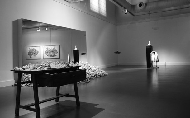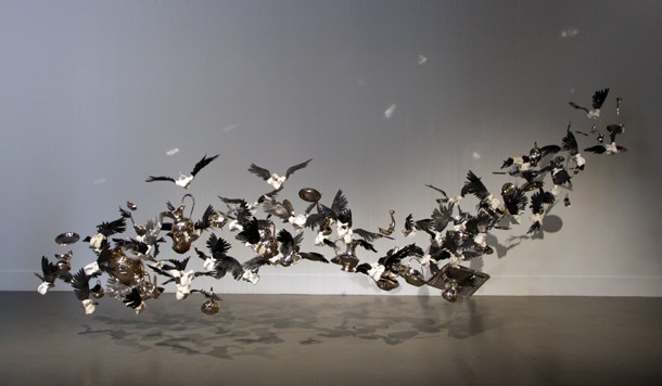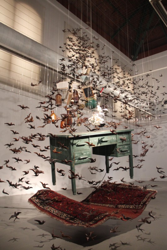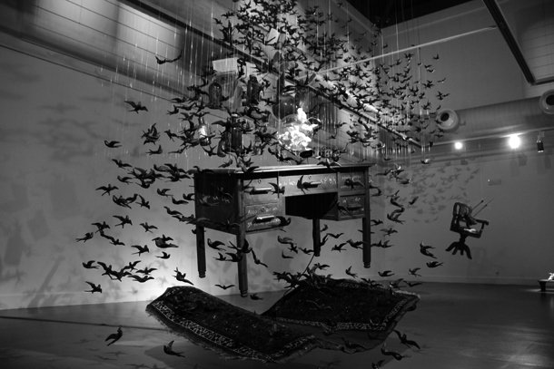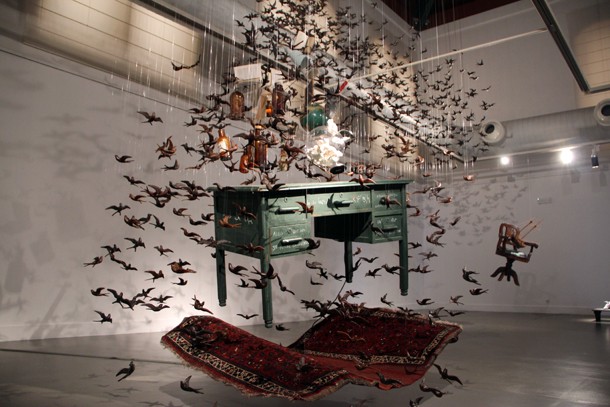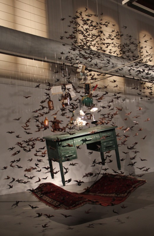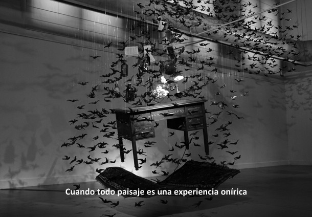 Sobre cada uno de los cajones del escritorio puede leerse, escrita a tiza blanca, una enigmática frase. “Algo que no se puede encontrar’, “abandonando cuerpo y conciencia” y “un pez describe el océano”. Quizá fuera suficiente argumento para detenerse a reflexionar sobre los significados y la intencionalidad del autor al escribirlas. Quizá, sino fuera porque por encima de máximas y pensamientos llama la atención que la mesa levite sobre una alfombra y ésta, a su vez, esté suspendida en el aire a medio metro del suelo. Alrededor de ambas sobrevuela una multitudinaria bandada de golondrinas que envuelven botellas de licor, tarros de aceites, perfumes, libros, cuadernos, una espada, una pequeña pizarra, una bola del mundo, un flexo iluminado, una brocha de pelo duro, una urna rellenada con huesos y un mapa. Los pájaros parecen buscar una salida y tratan de conducir el gabinete, enganchado a su estela, a través de los ventanales de la Sala de Exposiciones Amós Salvador de Logroño.