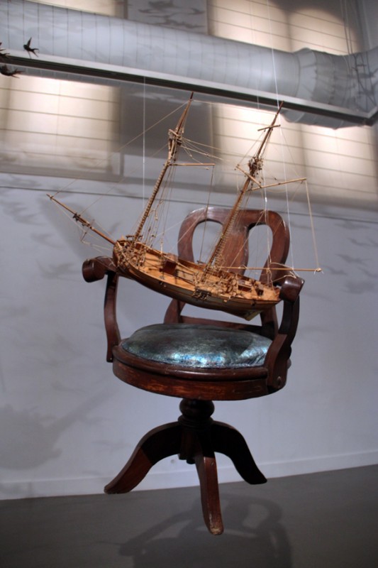 La ausencia de gravedad se expande a lo largo de la sala bajo la influencia de la obra de Pamen Pereira. Una silla flota suspendida mientras acuna un galeón herido y mutilado en sus velas. “Los objetos –señala Pereira mientras observa la obra- son las formas que adopta la materia, atrapados en el espacio tiempo, prisioneros de su propia consistencia, cuando levitan ingrávidos transportan a quien los observa a una dimensión atemporal, a un espacio onírico, liberador, en el que desaparecen presente, pasado y futuro”. Entonces la gravedad parece un sueño.