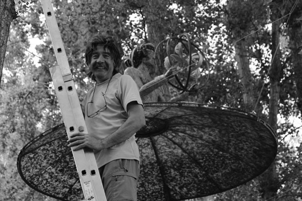 Junto a Carlos Rosales atravesamos de nuevo la carretera y nos introducimos en una pequeña arboleda junto a la ermita en la que los chopos han creado un laberinto natural. Allí, a tres metros de altura trabaja Óscar Cenzano en su ‘Danza de la luz’.