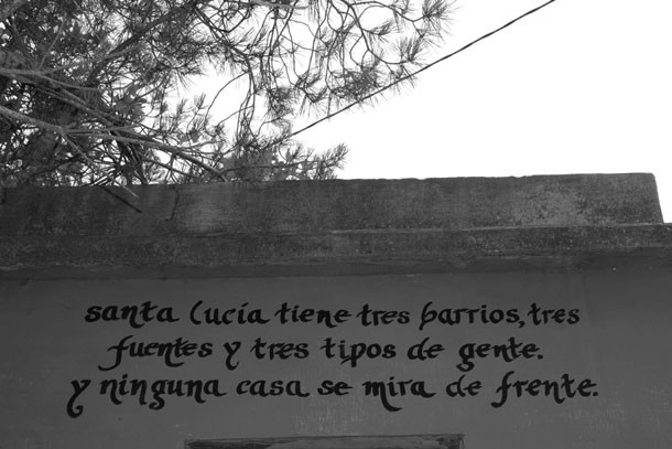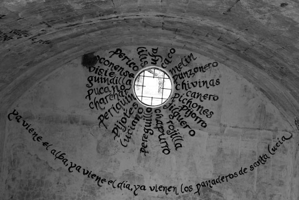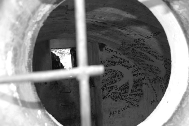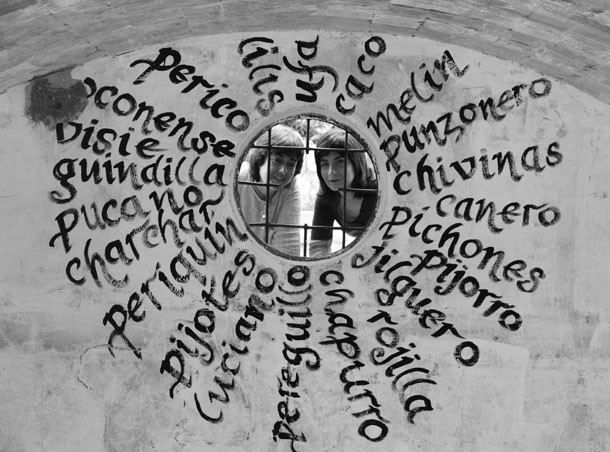 Una segunda fase que ha consistido, tal y como definen, “en dibujar con las palabras”. Ahora, al serpentear por la cuesta que recorre Santa Lucía desde la ermita hasta la zona alta, a mitad de trayecto, destaca el antiguo depósito de agua, inadvertido hasta haces tan sólo unos días. “Buscábamos –detallan Gil y Diego- un refugio para las palabras y encontramos el depósito, donde habitan ya las golondrinas, cuyos nidos hemos respetado y a las que hemos hecho cómplices del proyecto”. Un espacio que la magia de la creatividad ha transformado en un templo de las palabras, que las golondrinas mensajeras se encargan de difundir… “Ufa, aguarrón o ponzoneros”, se les escucha mientras vuelan.
