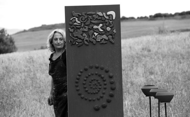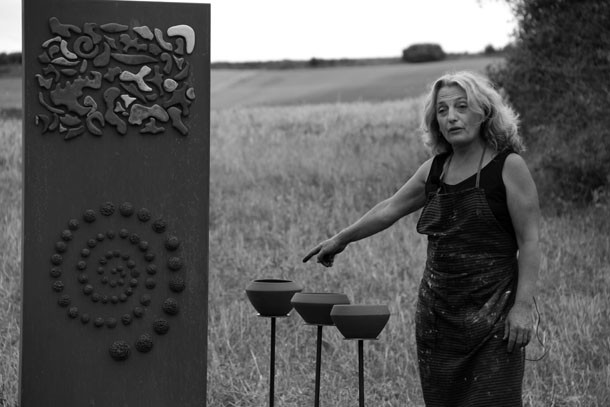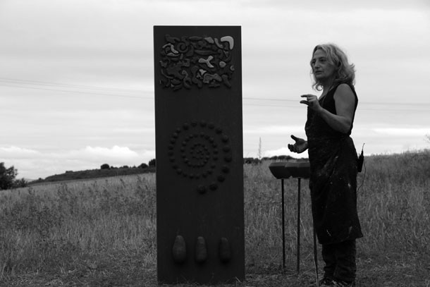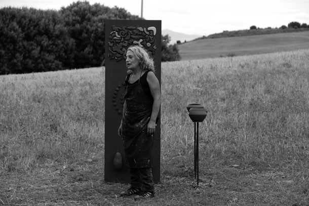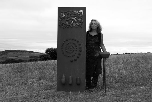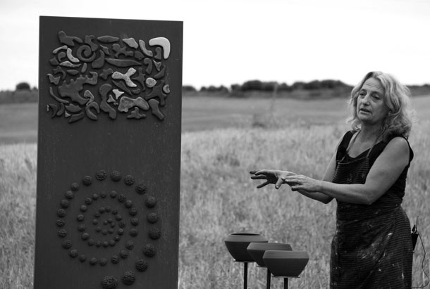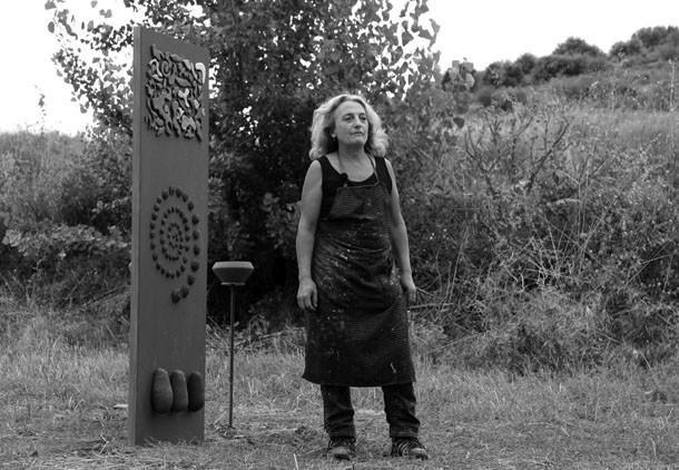 En el punto más alto de Santa Lucía el asfalto de las calles cede ante el camino de tierra que desciende hasta los campos de cultivo. Abajo, en la parcela contigua a la cruceta de señales que apuntan al molino o a la ermita, trabaja la escultora Julia Rubio. “Me motivaba el proyecto Arte en la Tierra –sentencia-, me idéntico con la idea que propone porque yo trabajo la tierra, a través de la cerámica, de pintarla, la utilizo es un elemento que utilizo en todos mis obras”. El atractivo de Arte en la Tierra para Julia no concluía ahí. “Además, está el componente comunitario, de comunicación con las gentes del pueblo, la idea de compartir, de colaborar. Ha sido increíble la gente que se ha implicado, la cantidad de amigos que han formado las cuadrillas para ayudarme”.
