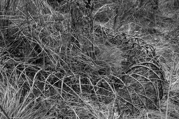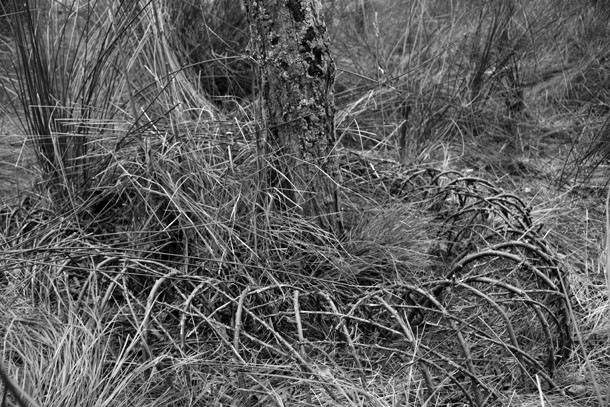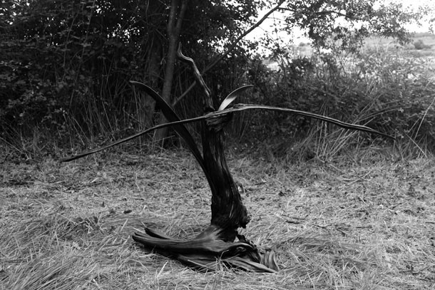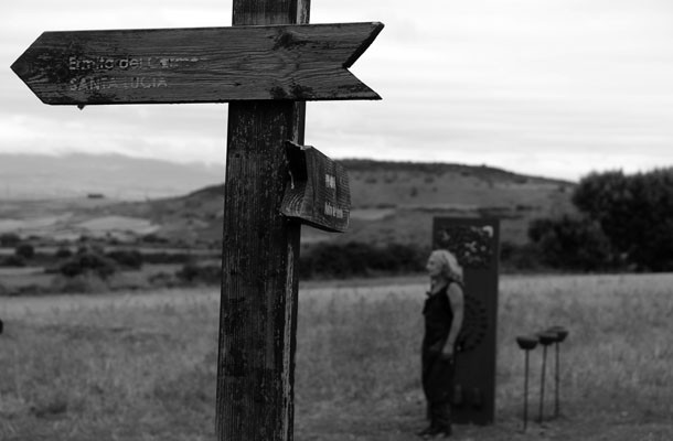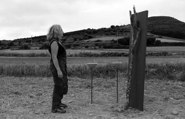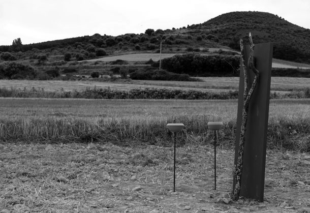 Al abandonar el bosque por la vertiente opuesta al acceso desde la ermita sorprende al figura de un hombre que mira hacia el oeste. Es Sergio Ferrúa. “Han sido dos o tres días –explica- buscando la huella”. La huella es esa señal que en un instante determinado surge y entonces, el artista escucha las palabras mágicas. “Buscaba un sitio específico –recuerda- y el serpenteo de los restos de paja sobre el campo trillado me condujeron como si de un camino se tratara hasta un pequeño bosquecillo. Aquel era el lugar, el sitio específico, donde coincidían opción y lugar”.