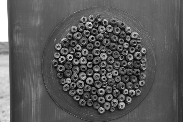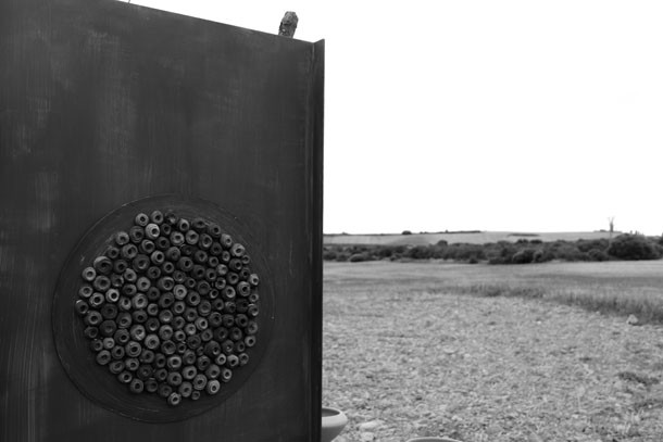 ‘De la tierra al cielo, luciérnagas en Casiopea’ es la propuesta de Rubio en Santa Lucía. Cinco monolitos de tierra con incrustaciones de arcilla, acompañados de tres recipientes de barro que dan presencia a los elementos, a la tierra, el fuego y el agua. “Concibo mis obras –describe- desde arriba, desde lo alto, como si fueran mapas”. Así, los cinco monolitos, situados en campos agrícolas en diferentes puntos bajo la zona urbana de Santa Lucía, proponen un recorrido que permite descubrir algo más que lo que se percibe a simple vista. “Cada pieza –explica Julia- ha sido realizada con la tierra del pueblo, no sólo del pueblo sino con la tierra específica de cada parcela donde se ubican. Cinco tierras, cinco elementos”. Junto a los monolitos, como recordando su origen y el del espacio natural donde han sido ubicados, tres recipientes contienen los elementos básicos tierra, agua y fuego. “Los llamo potiza –apunta Julia- como homenaje a las personas que vivieron aquí y tuvieron que emigrar. El primero contiene la tierra recogida tal cual y para darle forma la arcilla ha sido cocida; el segundo, cocido a más baja temperatura, acoge el agua; mientras que el tercero, cuya estructura no ha pasado por el proceso de cocido, presenta las piedras”. ¿Y las luciérnagas? Las luciérnagas esperan su momento camufladas tras los monolitos. Su momento es la noche, cuando en conexión con las estrellas de Casiopea iluminaran el doble asterisco –como si de un reflejo se tratara- que formaran entre el cielo y le suelo.
