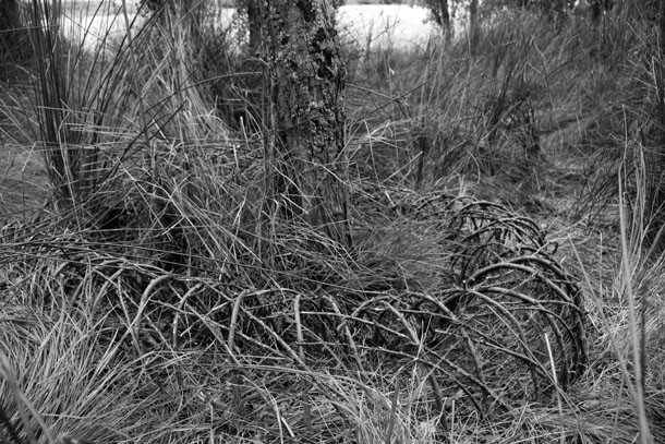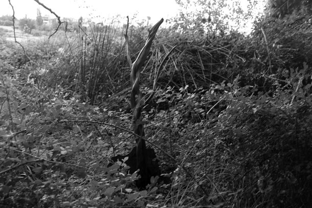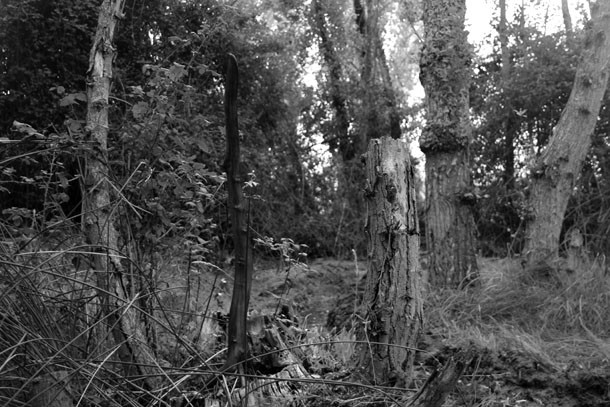 El grupo de árboles se sitúa a quinientos metros de la carretera. Dos enormes chopos ejercen de puerta de acceso a un espacio casi diáfano, en el que un tercer chopo hace de eje central. “De inmediato supe que era aquí –describe-, así que comencé a desarrollar ‘Labranca’, la lombriz de tierra”. Sergio Ferrúa propone una reflexión sobre lo que sucede bajos nuestros pies. “Se trata –resalta- de una interacción biológica, de una reflexión sobre la pirámide de la vida”. Del retorno entre unos seres vivos y otros.