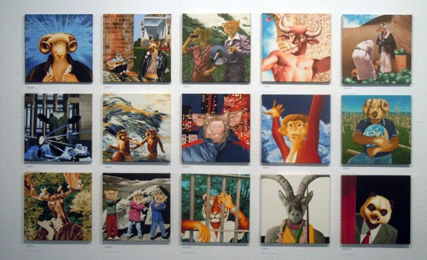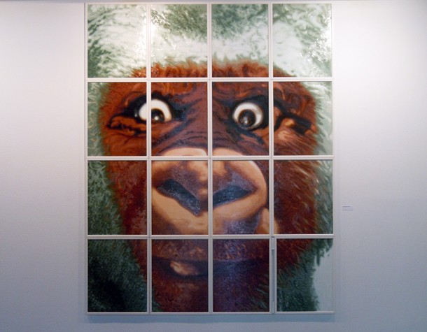 El rostro a tamaño gigante de un gorila –Rei Floc- ‘mirando pintar casas’ da la bienvenida al visitante cuando atraviesa la puerta de entrada a la Sala de Exposiciones Amós Salvador. Un óleo de Carmelo Hernando que ejerce de distribuidor de la muestra ‘Un Canon’. Un recorrido por su obra desde 1972 a 2013 –no cronológico- que acoge desde su primer dibujo, el que le sirvió para aprobar el examen de acceso a la Academia de Bellas Artes de San Fernando, hasta lo que él denomina sus trabajos más recientes, en los que se encamina por los senderos de la pintura al óleo sobre tela.