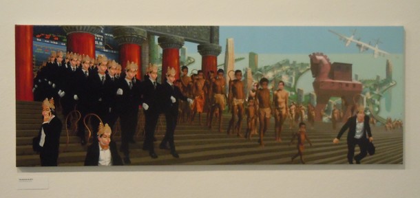 Una ironía y un sarcasmo que se percibe en su obra a lo largo del tiempo. En ‘El futuro ya está aquí’, en sus versiones de la ‘Estatua de la Libertad’ y de otros referentes universales, al pintar sus peculiares ‘encargos reales’ o en ‘El día del Enola Gay 1945. Dios pierde su ojo oriental’. También en sus series de pintura. En ‘Carne de cañón’ o en ‘Humanos y la máquina’. Todas sus trabajaos pueden entenderse como reflexiones de su tiempo siempre cargadas de un dosis adecuada de provocación.
