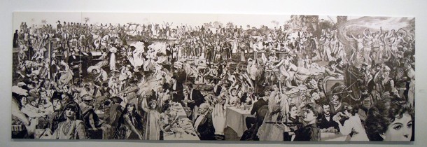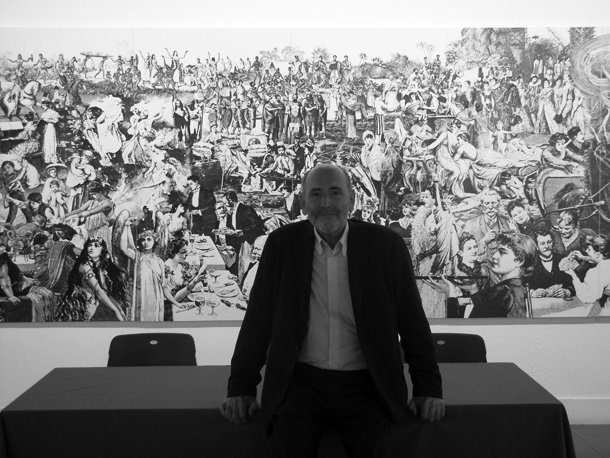 El pintor está orgulloso y agradecido por la posibilidad de exponer en la Sala Amós Salvador una panorámica completa de su obra. También está feliz y así lo reconoce por tener la oportunidad de mostrar, por fin en gran formato (131x39,9 cm), el fotomontaje ‘Todo el siglo XIX, a la manera de Ernst’. Un deseo hecho realidad.