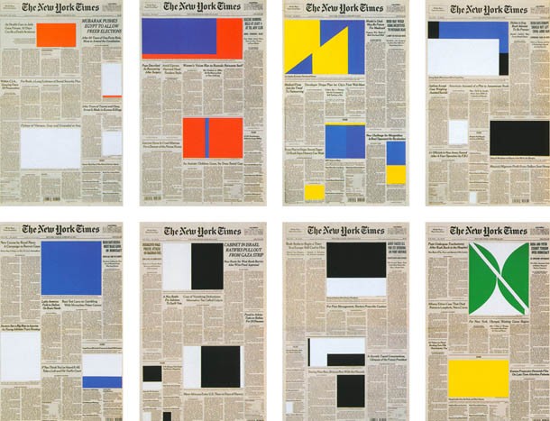 Otros artistas, sin embargo, dejan el texto intacto para intervenir en la imagen trabajando sobre los recuadros dedicados a las fotografías que ilustran las noticias. Un gran referente es la obra de Marine Hugonnier (Francía, 1969). Esta artista, que también trabaja sobre las portadas, en obras como ‘Art for Modern Architecture, New York Times and Keyhan: The Iranian revolution and the hostage crisis 1979-1981’ (2011) sustituye las fotografías por reproducciones de cuadros de Ellsworth Kelly. Desde 1950, creadores como Ellsworth Kelly estudiaron a fondo complejos fenómenos pictóricos tomando la ventana como punto de partida, entre ellos los mecanismos de canalizar la mirada del espectador, las similitudes de este objeto con el marco de una pintura, la transparencia y el reflejo, las luces y las sombras[4]. Kelly, a su vez, sólo emplea colores puros y fabrica formas geométricas que no se refieren a nada, sino que sólo son experimentos de forma y color.