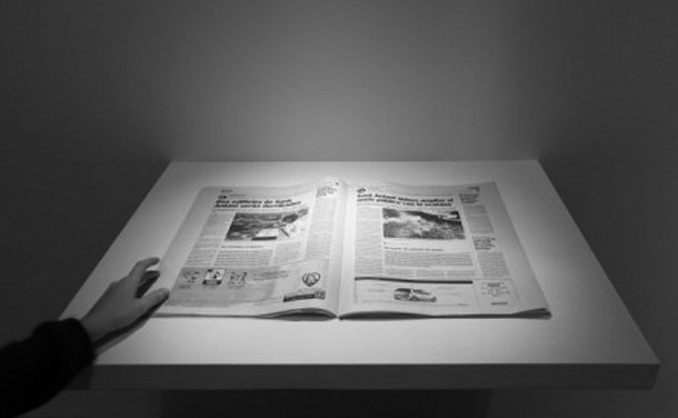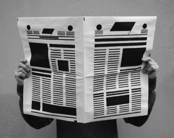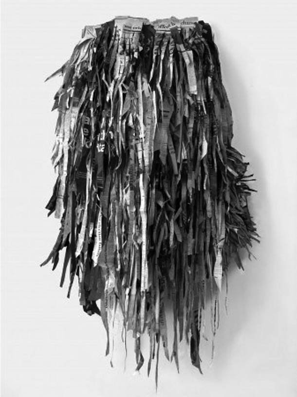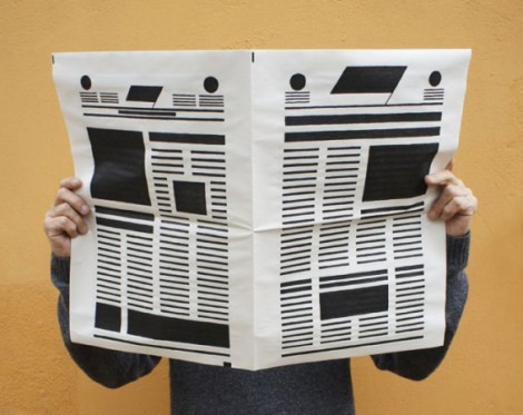 Por último vamos a ver algunos ejemplos que trabajan con el periódico en un sentido físico, como materia prima para crear, sin olvidarnos de que es un objeto cargado de sentido: encierra la historia política y social, los flujos económicos que determinan las posibilidades de vida, los obituarios, los anuncios de servicios sexuales, etc. Es un papel impreso que retiene testimonios y relata la forma de vida de la sociedad a la que se dirige.