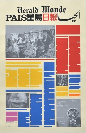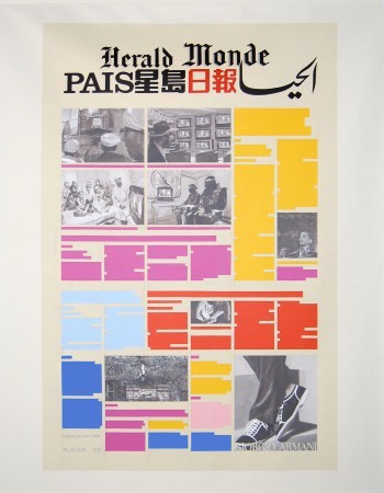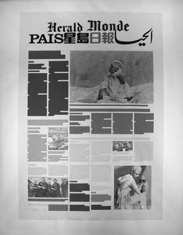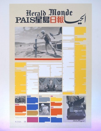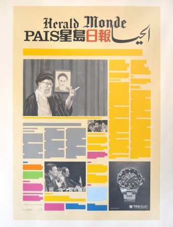 Kamran Diba (Irán, 1937) en su serie ‘Portada’ (2009) trabaja con la temporalidad del objeto-periódico, un elemento que tiene una corta durabilidad (un día) y que es desechado tras ese periodo. Además trabaja con la idea de lo global (los periódicos aunque cuenten con una sección Internacional suelen acotarse a lo local/nacional) creando collages multilingüísticos y con narrativas diversas que simulan la portada, o primer página de un diario de noticias.