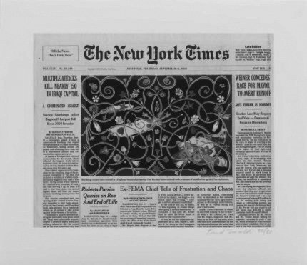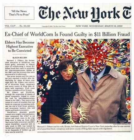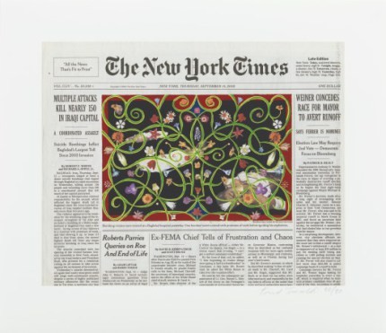 Fred Tomaselli (Estados Unidos, 1956) en piezas como ‘Guilty’ (2005) o ‘Sep. 15, 2005’ (2010) también interviene sobre la imagen principal de la portada de un periódico, en este caso el New York Times, cambiando la realidad de esos escenarios, embelleciendo las imágenes de muerte o bien creando monstruos de los personajes retratados.