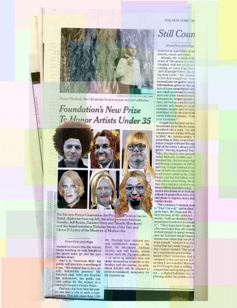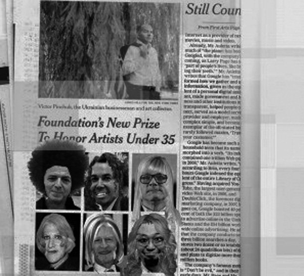 Rachel Harrison (Estados Unidos, 1966) combina género y humor en alguna de sus piezas como ‘Lo que el mundo necesita ahora’ (2007) donde, para demandar una mayor presencia femenina en puestos de poder o lugares de éxito e interés, traviste a los personajes masculinos de la noticia colocándoles pelucas rubias a modo de collage y maquillaje en color sobre la imagen en blanco y negro.