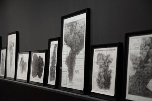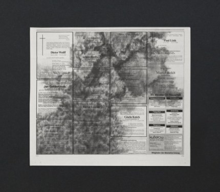 Mauro Vallejo (España, 1981) en su obra ‘Partículas en suspensión’ (2010-2011) interviene sobre esquelas de periódico con lápiz y polvo de grafito creando imágenes de polvo o humo. Los dibujos parecen fotografías captando un momento de implosión, de la evaporación del cuerpo tras la muerte, extendiéndose éste sobre el espacio recién desocupado por la persona que muere. Estas piezas muestran su interés sobre la existencia y la muerte, la caducidad de los materiales (como el periódico y el polvo) y la revitalización de éstos al ser convertidos en obras de arte.
