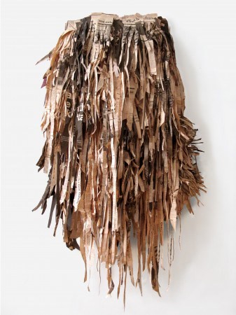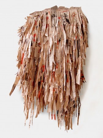 Sara Ramo (Brasil/España, 1975) en su serie ‘Contrato’ (2012) se centra en trabajar con periódicos especializados en economía para crear serie de cinco esculturas-collage con tiras de papel extraídas de sus hojas. En el desorden, en el caos, Ramo se cuestiona hasta que punto los objetivos y artificialidades influyen en la vida de los seres humanos.