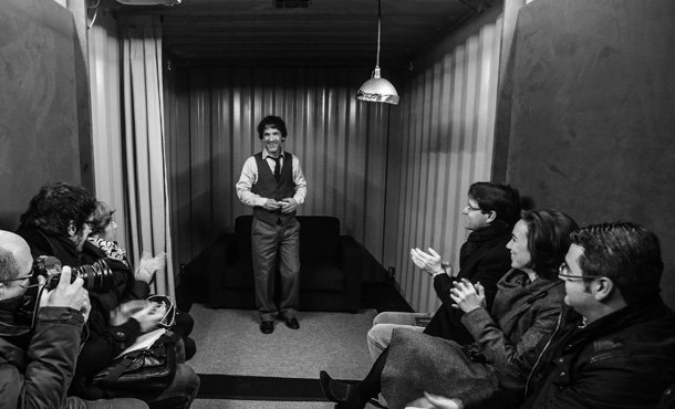 Y es que en el estreno de ‘Contenedores de Arte’, el actor portugués Miguel Borgues consiguió que la energía de su interpretación recorriera las cuatro paredes del contenedor. Un habitáculo de seis metros de largo y dos y medio de ancho, con un escenario de apenas dos metros desde el que intérprete representa ‘La vieja’. La obra es una sátira basada en una obra del escritor ruso Daniíl Kharms defensor del surrealismo y el absurdo y permite a Borgues mostrar un sinfín de recursos dramáticos apoyado tan sólo en un sofá, una maleta y una pequeña lámpara. Todo comienza al preguntarle la hora a una anciana… y de cómo librarse después del cuerpo de la mujer…
