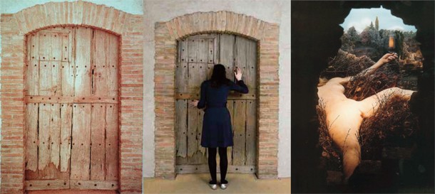 La primera es 'Étant donnés', realizada por Marcel Duchamp entre 1946-1966. Se trata de una obra que cabalga entre el ready-made, la escultura y la instalación. Duchamp construyó una puerta cerrada en la que el espectador, al examinarla, encontraría dos pequeños orificios a través de los que descubriría una escena inquietante, que cabalga entre el erotismo y el pavor. La imagen nos muestra a una mujer desnuda que sostiene en alto una lámpara de gas resplandeciente, está tumbada sobre un lecho de ramas secas, con el rostro oculto, dejando al descubierto su vagina.