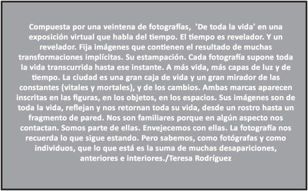 La fotografía para Teresa Rodríguez constituye una manera de mirar y acercarse el mundo, es una manera de vivir. Pertrechada con su cámara, captura el instante y lo devuelve en forma de imagen. Entienda que la imagen es una invitación a contemplar. Al contemplar se cierra el circulo de la comunicación, pues quien contempla hace suya esa mirada.