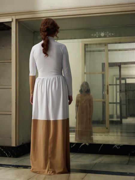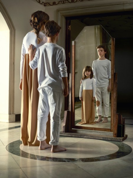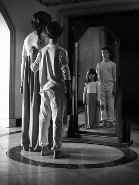 El binomio adulto-niño como respuesta del espejo (que presuponemos como una réplica neutral, aunque no lo sean los ojos que lo miran) viene a enfatizar la función del vestuario tratando de revelar ese yo verdadero que ha quedado escondido tras el miedo.