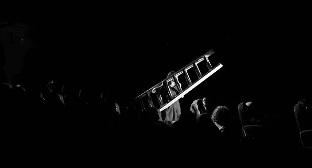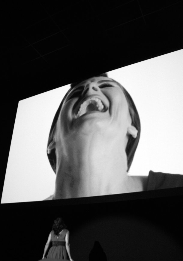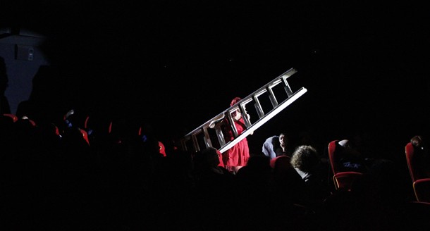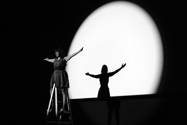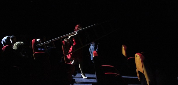 Pero además, ‘Mujeres que no volverán a pasar hambre’ es una extraordinaria obra de teatro, que mantiene al espectador alerta al tener la capacidad de transformar la sala de cine en un teatro en cada uno de sus rincones, incluidas las butacas desde las que los asistentes siguen la interpretación. Un montaje complicado en el que todo tiene que funcionar perfectamente sincronizado y así ocurre. Con una iluminación espectacular en la que el rojo intenso del vestido de la actriz dibuja estelas sobre la oscuridad ligeramente atenuada de la sala y el resplandeciente blanco de la pantalla.