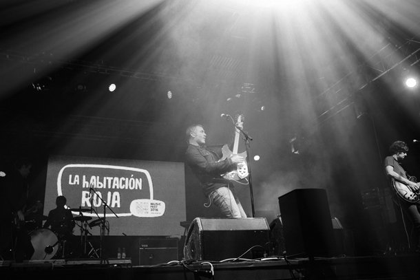 Pero vayamos a la música y al festival en sí mismo. El viernes 26 se pudo observar a la mayor parte de esa ‘comunidad musical riojana’ (músicos, promotores, medios de comunicación, aficionados habituales, etc.) paseando por el entorno de Franco Españolas , aquello fue casi un ‘quién es quién’ que se ampliaba a parte de los representantes políticos riojanos y logroñeses así como al conjunto de la sociedad. No estaba masificado el festival pero ofrecía un buen aspecto de público que vio cómo se retrasaba el inicio de los conciertos en más de una hora, lo que fue lastrando la tarde – noche, siendo uno de los pocos ‘peros’ que podíamos señalar. Mientras saludábamos a unos y a otros y también a amigos y amigas venidos de otras ciudades, los catalanes Stay actuaban con su Rock psicodélico que iba convenciendo. A continuación llegó el turno de inclasificable Bigott, el zaragozano tiró de su extensa discografía y presentó temas de su próximo trabajo. Pero los dos platos fuertes estaban por llegar, siendo el primero el de los murcianos Neuman, con Paco Román a la cabeza y en formato trío, habiendo actuado antes en acústico en la bodega. Neuman es uno de los grandes grupos del indie y no cabe duda que cuentan con grandes canciones, que van desde el Power Pop hasta texturas más épicas. En su concierto en MUWI funcionaron mejor las primeras en nuestra opinión, ofreciendo un concierto solvente muy aplaudido especialmente con temas como ‘Turn It’ o ‘Tell You’. Pero la gente estaba esperando a La Habitación Roja, los valencianos acaban de publicar este año su décimo disco de estudio, Sagrado Corazón, y cuentan con dos de los mejores discos de los últimos diez años como son Universal (2010) y especialmente Fue eléctrico (2012), sin duda alguna su cima. Liderados por Jorge Martí, La Habitación Roja hicieron un set rápido basado en su nuevo disco y con los temas más característicos de su carrera. No dieron tregua y nos dejaron sin aliento, fundamentalmente cuando sonaron ‘Ayer’, ‘Indestructibles’ o ‘La segunda oportunidad’. Incluso los temas de Sagrado Corazón ganaron en fuerza con un directo que nos dejó con ganas de más a pesar de la hora, cercana a las tres de la madrugada.
