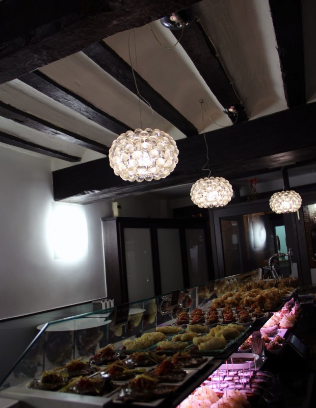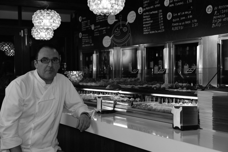 Yo empecé en mis tiempos jóvenes como camarero; era una forma de ganarme la vida mientras estudiaba. Trabajé con un amigo que tenía un negocio y allí ya empezó el gusanillo que me decía que aquello me gustaba. Lo que pasa es que luego, por circunstancias personales -mi padre murió cuando yo tenía doce años, mi hermano mayor tenía tres años más que yo- la situación familiar estuvo complicada. Mi hermano siguió trabajando en el negocio de mi padre y llegó un momento en que yo me tuve que poner como socio; así estuvimos quince años. Nada que ver con la hostelería. Pero llegó un momento en la vida en que o haces lo que crees que tienes que hacer o ya lo dejas y te olvidas. Y ahí fue cuando decidí que había que tirar para adelante y que había que hacer lo que uno quiere. Dejé la empresa que tenía con mi hermano y le vendí mi parte. A partir de ese momento puse todos mis empeños aquí, en el ‘Tastavin’. La ubicación me parecía muy importante y la calle San Juan para mi ha sido muy querida siempre como cliente. Siempre ha sido un rincón de Logroño que me ha parecido especial, por su singularidad, por su vecindad… aposté por ello en un mal momento, en muy mal momento, porque entonces todavía se pagaban traspasos altos, la mano de obra estaba carísima, especialmente la de los cocineros. Fue un comienzo complicado; complicado pero también bonito. Con mucha ilusión pusimos en marcha el restaurante, con una respuesta de público buena. Lo que nos hizo cambiar a bar de pinchos fue… la puñetera realidad; la situación económica. Puedes vivir de un sueño, pero a final de mes tenemos que pagar hipotecas, etc…, era inviable. Económicamente era inviable, por eso cambiamos. Pusimos la barra y mantuvimos un tiempo las dos opciones, pero no dábamos a vasto. Lógicamente decidimos que el negocio más rentable y bonito era el bar de pinchos.