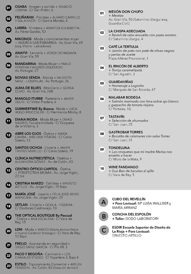 Un extraordinario abanico de creadores que intervendrán en María José Joyería, Mikonos, Anayvi Lencería, Centro Óptico Capitol, Osaba, Vinoteca Larría, Freijo Avanzado en Seguridad, The Optical Boutique By Pascual, Mandarina Moda Mujer, Feliñarán Floristas, Estilo Equipamiento Comercial Mobiliario, Iturbe Pastelería, Setlan Moda Mujer, Santos Ochoa, Diana Moda Mujer, Alma de Blues Mobiliario, LDM Moda, Novias Senda, Paco y Begoña Carnicería, Abrelosojos Óptica, Summertime By Bianca Moda, y Cristina Marzo Estilistas. 23 comercios que entienden la irrenunciable relación entre el diseño y el comercio como camino para aumentar la visibilidad de los establecimientos.