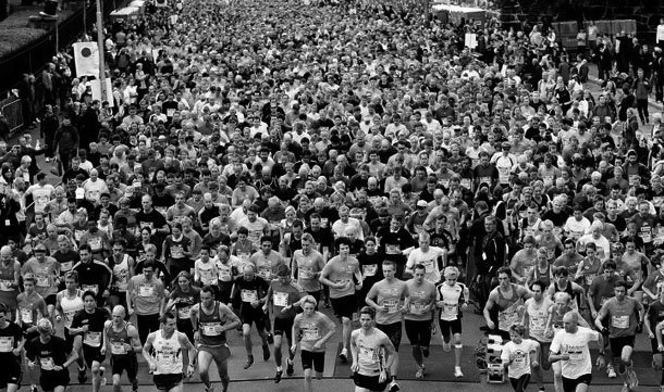 Son las piernas y la sensación de fiesta que acompaña a cada inicio de un maratón lo que provocan una nueva sensación de felicidad. El ritmo que consigues poco a poco te va recordando que has pasado dos meses y medio preparando ese día. Así que corres. Sabes que va a ser duro, pero corres. Después, la carrera saldrá mejor o peor, habrás cumplido tu objetivo más exigente o el de cruzar la meta, pero cuando comienzas a dejar tus zancadas, más o más que menos elegantes, por el asfalto sabes que ese es el día que estabas esperando y que toca disfrutarlo junto a miles de corredores que comparten la misma celebración.