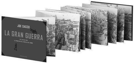 Si has leído a Joe Sacco sabes que su dibujo es preciso, minucioso, fiel. Su retrato del Somme huye del expresionismo atroz de los grabados de guerra de Otto Dix y convierte en dibujos las fotografías conservadas de la batalla, hasta que vemos los rostros de los soldados desencajados por el miedo y el dolor. Entonces sí, los dibujos de Sacco conectan con los grabados terribles del artista alemán. En el cuadernillo incluido en el estuche que guarda el desplegable, hay un pequeño ensayo de Adam Hochschild sobre la batalla y seis páginas con 49 notas en las que Joe Sacco explica qué ha dibujado en cada lámina. Artículo y notas son más que necesarios para valorar esta obra que nos enseña a mirar. Cuenta Guillermo Altares que “en la batalla del Somme nacieron el siglo XX y Mordor”: en trincheras enfrentadas estaban Tolkien, entonces un joven oficial británico, y Hitler, un anónimo soldado que aún no había recortado su bigote. Vieron el mismo horror y, sin embargo… Para despertar vuestro deseo, os dejo este estupendo vídeo lupa que enfoca nuestra mirada a los detalles, mientras el propio Sacco nos cuenta cómo y por qué ha emprendido esta fantástica aventura./Joaquín Armada desde el blog 'Después del Hipopótamo'