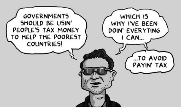 Filantrocapitalismo: Sí, al corrector de erratas de Word le parece una palabra increíble y la subraya como una errata, lo que no ha impedido que Bill Clinton se haga millonario difundiéndolo. Con su libro ‘Giving’, el expresidente estadounidense ganó 6,3 millones de dólares… pero sólo donó uno. Esta nueva forma de hacer negocios a través de la caridad ha creado expresiones como ‘venture philanthropy’ (capital riesgo filantrópico) ó ‘impact investing’. Bono, el cantante de U2, fue durante años un defensor del filantrocapitalismo en Davos, mientras defendía sin complejos su burla al fisco irlandés y planeaba forrarse con un enorme rascacielos en Dublín. Después de leer a Robinson, es difícil no escuchar la gran canción de U2 con esta letra creada por Paul O`Toole: “I want to run, my Money to hide (…) I want to seek shelter from income tax pain / Where the accountants have no names”.